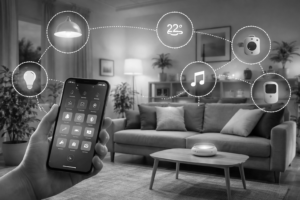 Stell dir vor, die Haustür entriegelt sich von selbst und das in die Decke eingelassene LED-Band gibt ein warmes indirektes Licht von sich. Die im ganzen Haus verteilten SONOS-Boxen beginnen mit der Lieblings-Playlist von Spotify. Du wanderst nach oben, das Licht geht überall automatisch an und leuchtet dir den Weg.